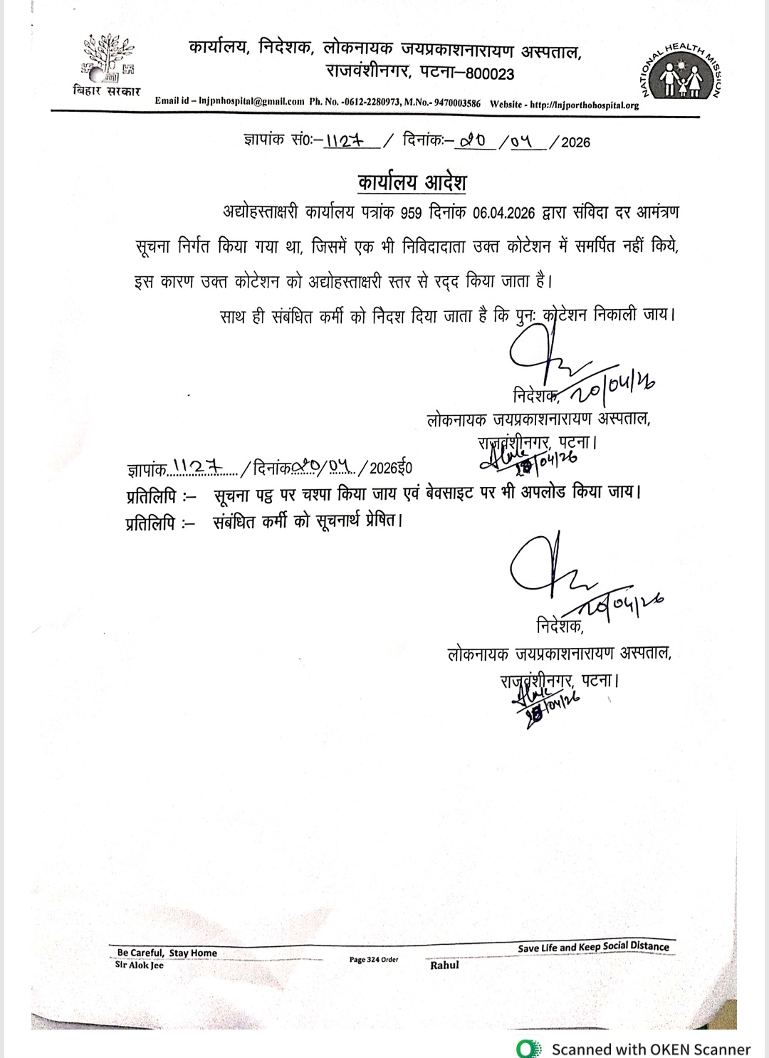 Notice - Inviting quotation to supply the dresses and other items for doctors and other staffs in LNJP Hospital, Patna